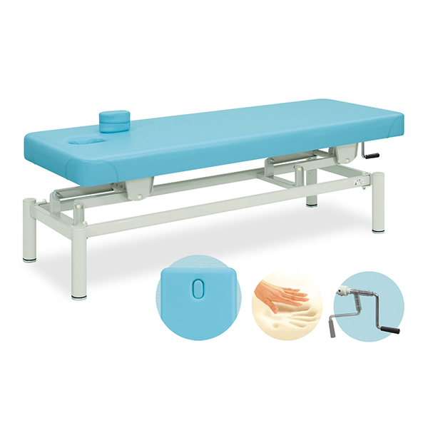 ■手動旋回昇降式で高さを調節できるクランク式ハンドル操作の施術台。